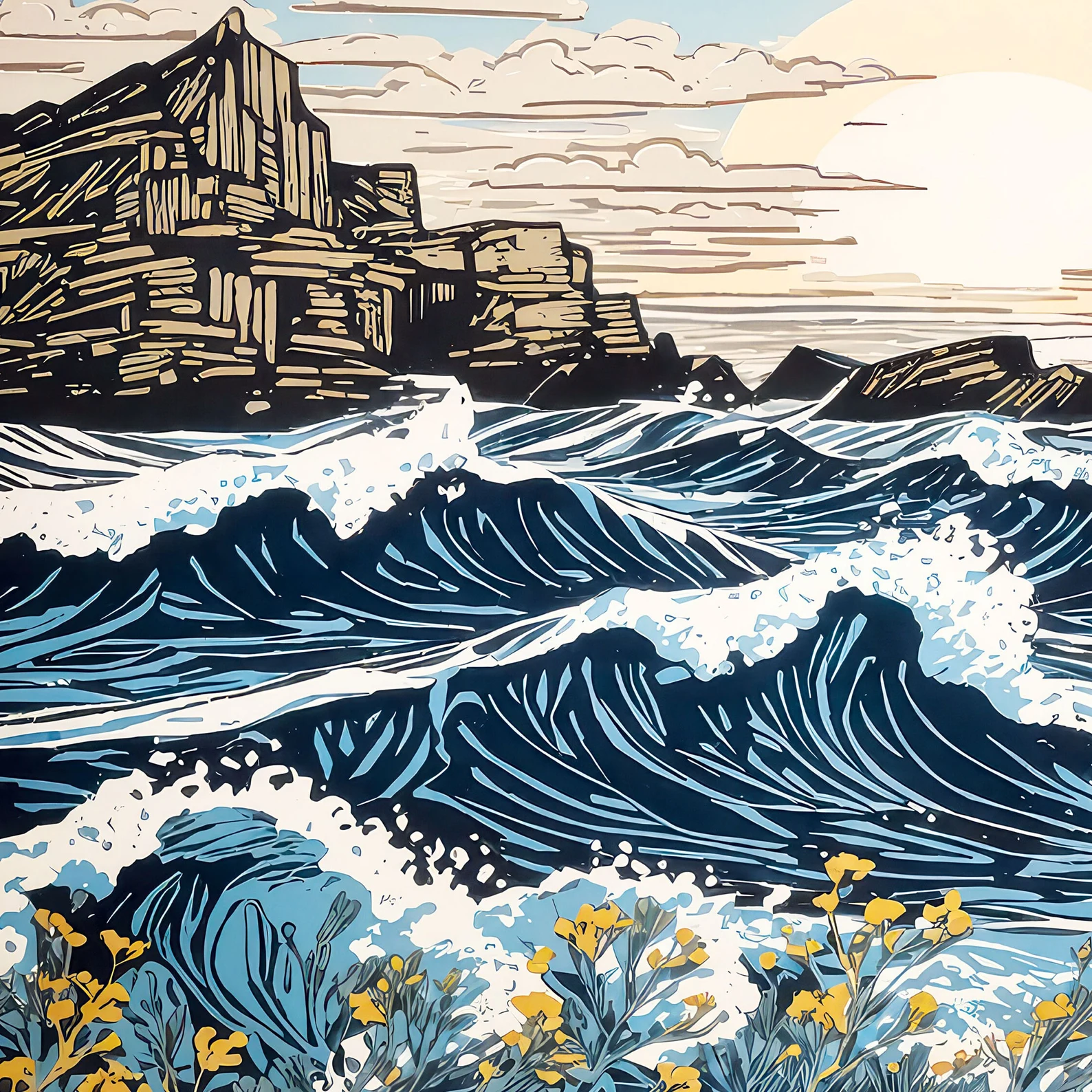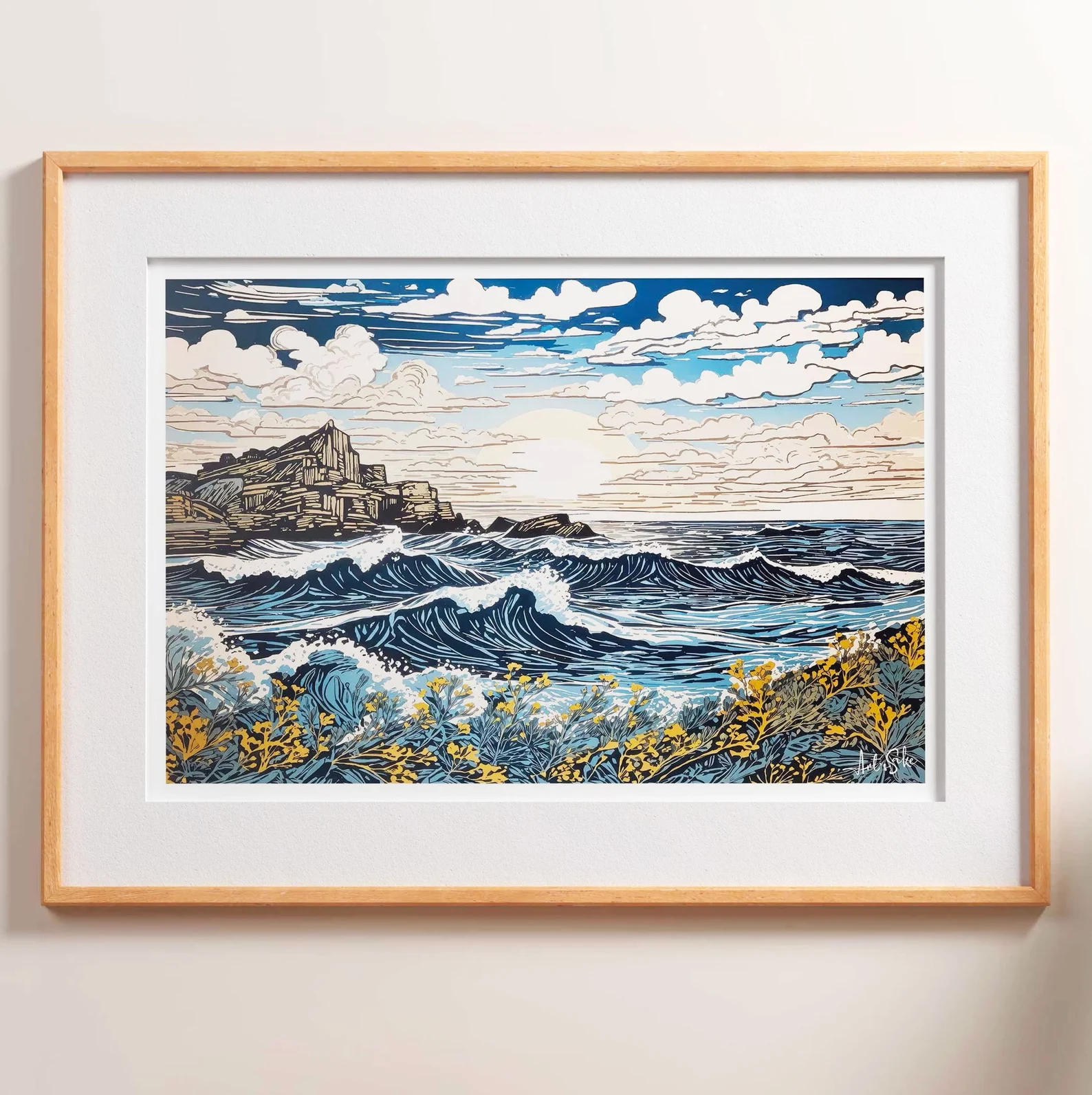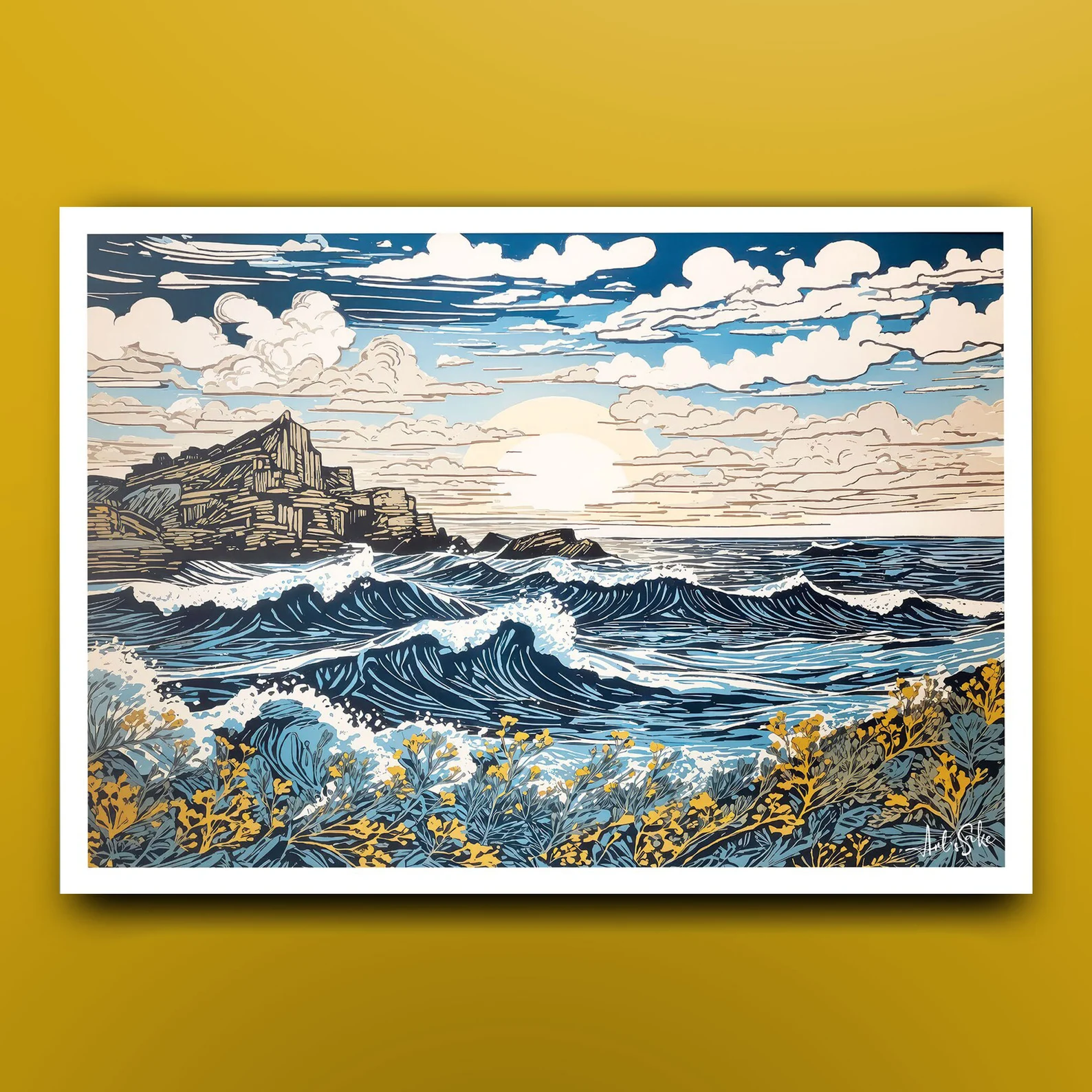 Experience the serene beauty of a “Cornish Sun over the Sea” with this original block print, a masterpiece of impressionist seascape art. Elevate your space with this high-quality art print, designed as a thoughtful gift for friends or family, bringing the vibrant charm of coastal landscapes to your walls.