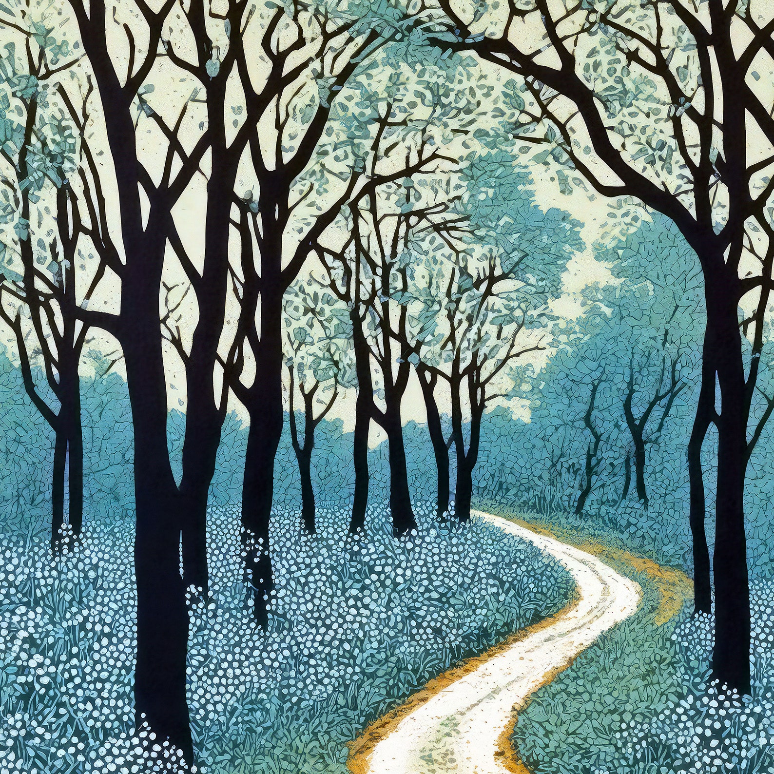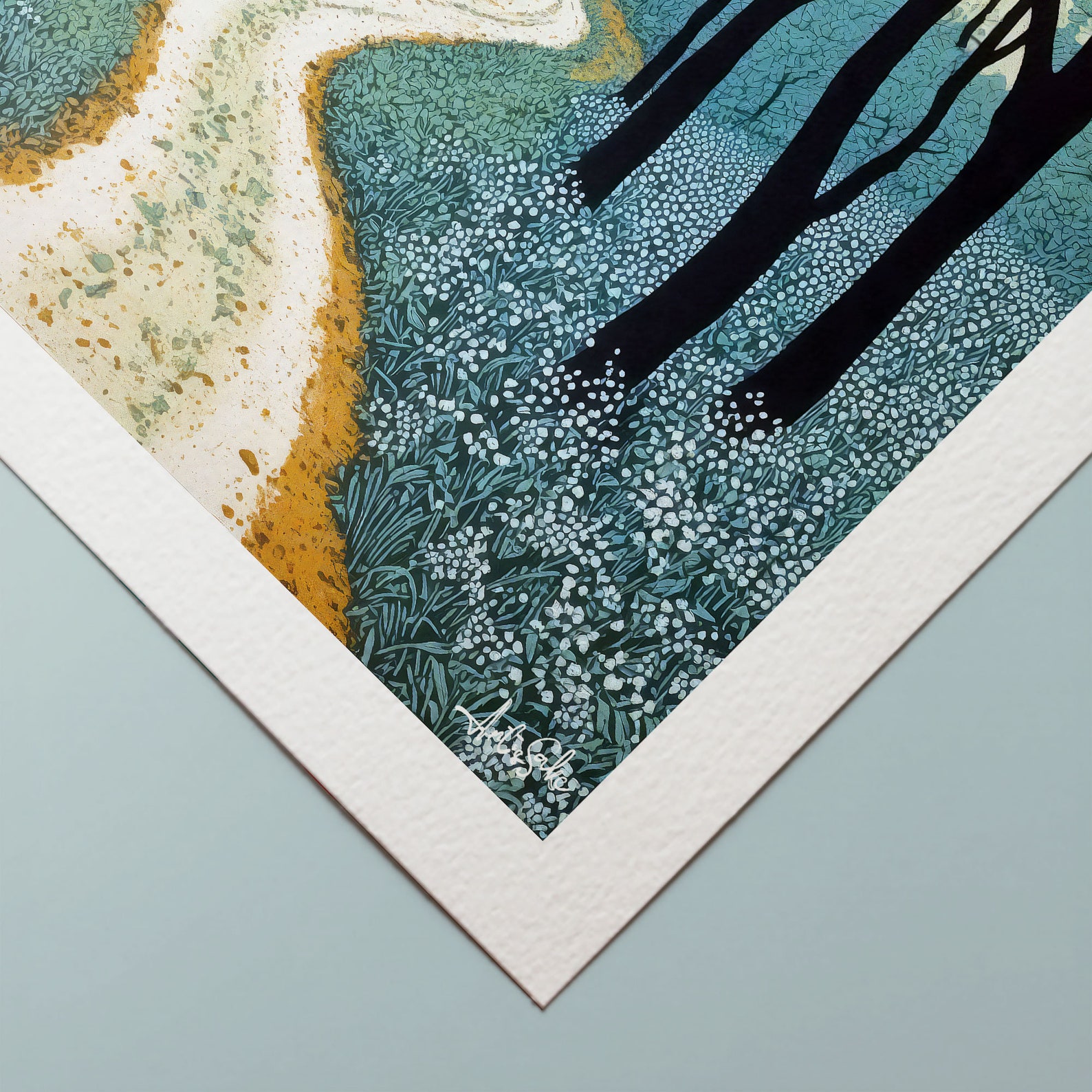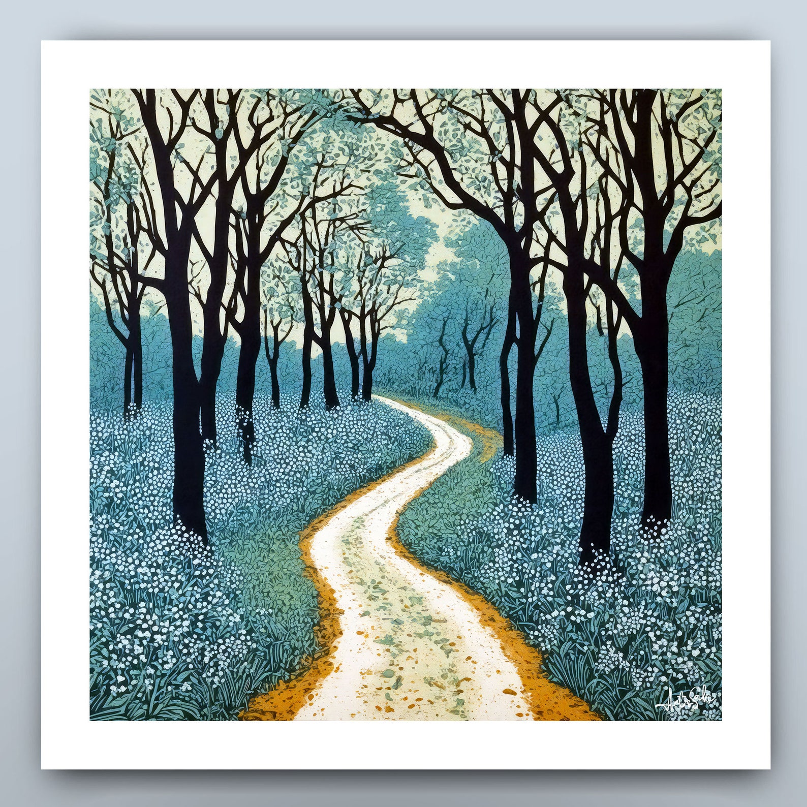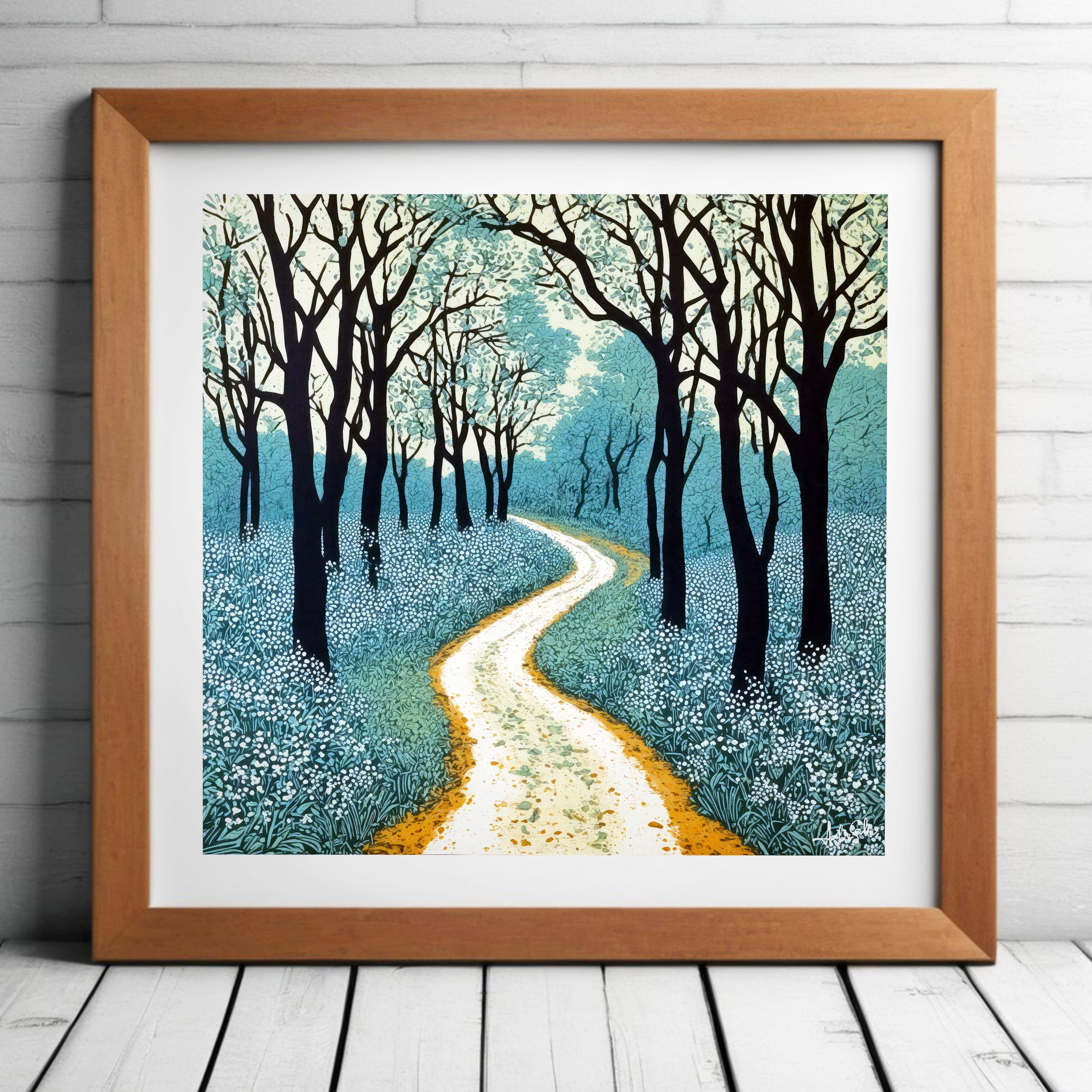 Step into the beauty of nature with “Down the Woodland Path” – a colorful and original contemporary landscape art print measuring 30x30cm (12×12″). This high-quality print is more than art; it’s a window to a vibrant world.